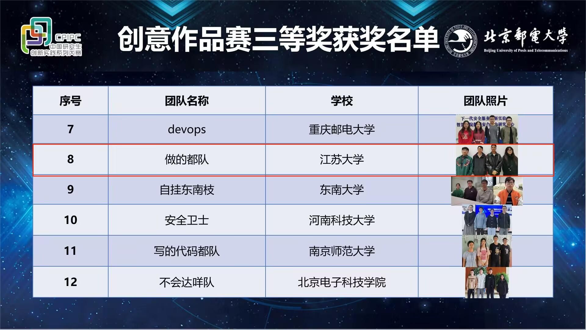 After receiving the invitation letter for the competition, our school actively responded to the call and vigorously promoted the competition through various channels. In order to select outstanding teams to participate in this competition, the Graduate School of Jiangsu University hosted the first China Graduate Network Security Innovation Competition hosted by the School of Computer Science and Communication Engineering. Eight outstanding teams were selected to participate in the national preliminary competition. During the preparation period, Professor Chen Jinfu, Vice Dean of the School of Computer Science, Associate Professor Song Xiangmei, Director of the Department of Cyberspace Security, and mentors provided guidance on topic selection, modeling, programming, and defense, encouraging participating students to fully demonstrate the spirit of Jiang University's daring and ambitious spirit. Jiangsu University has been awarded the title of National "Excellent Organizational Unit" for this competition.
